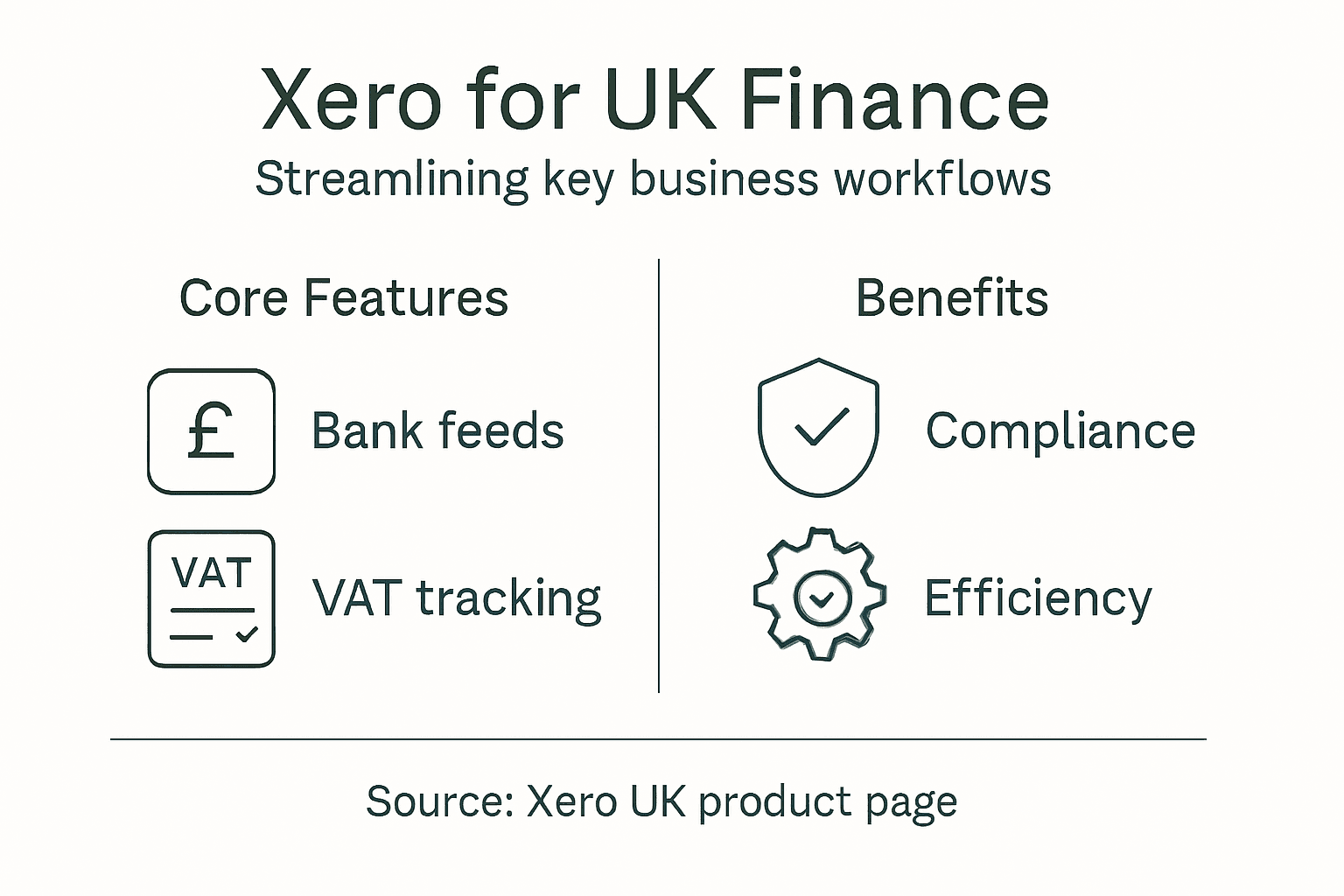 Xero offers features such as VAT compliance tracking, automated bank reconciliation, multi-currency management, customisable invoice generation, real-time financial reporting, and HMRC-compatible payroll processing.